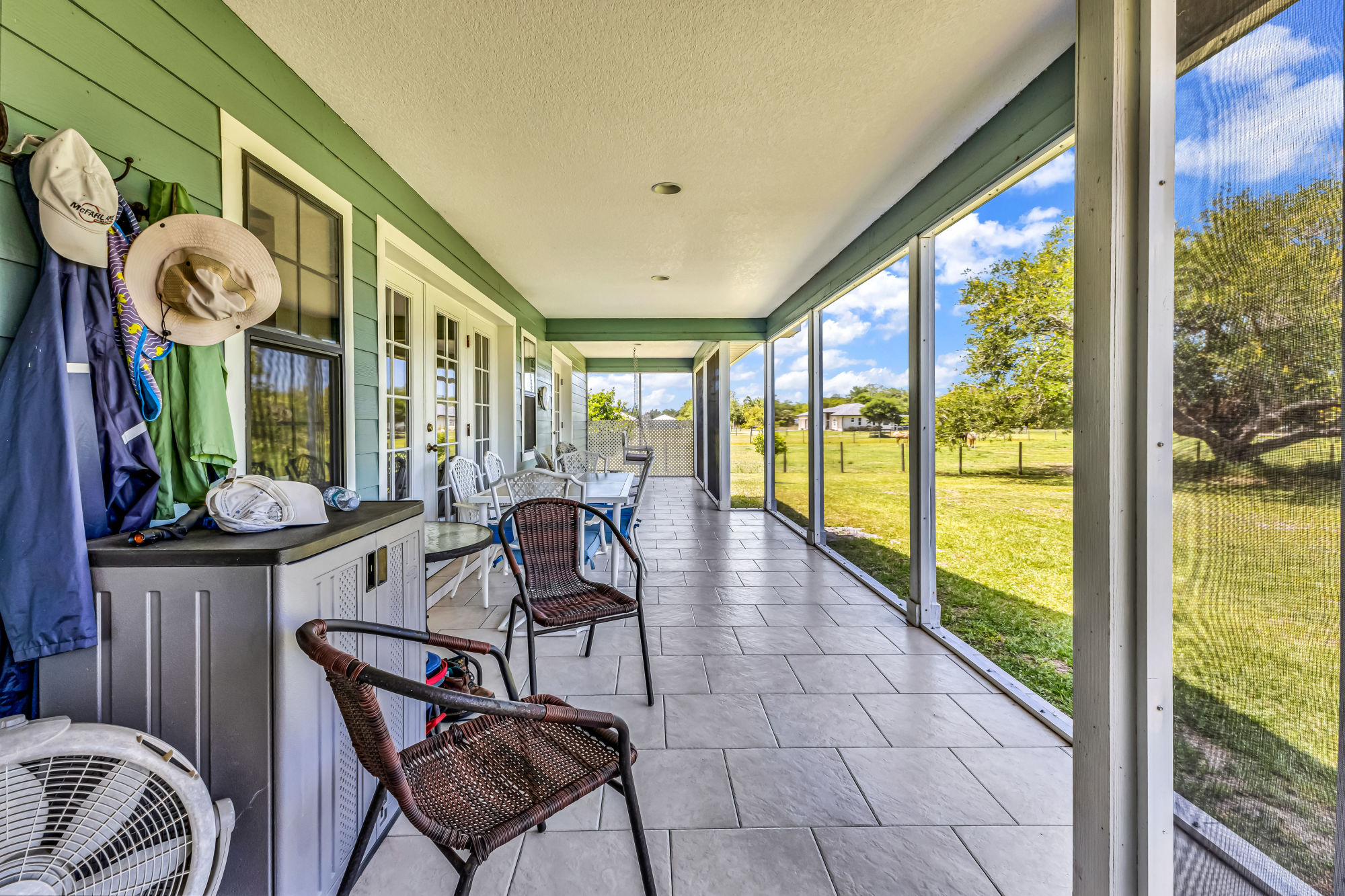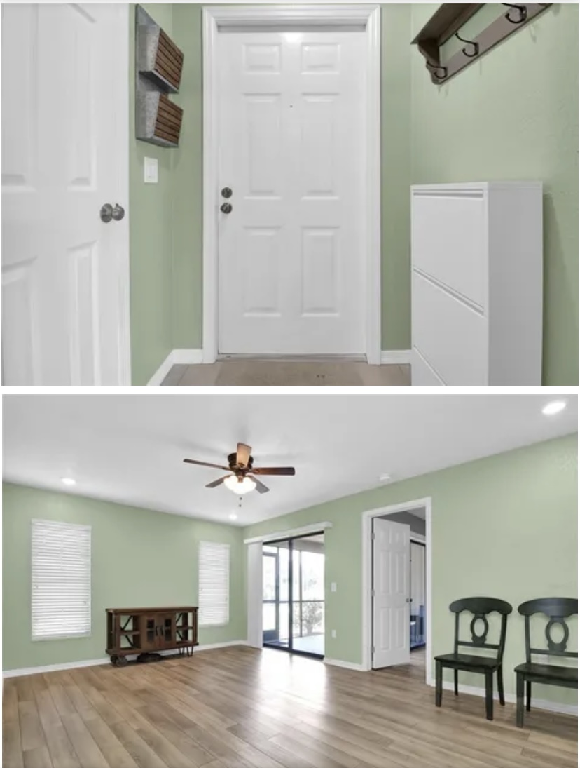 interior doors, hot water heater, patio screening, and shower head filters all updated in 2023. The layout features an open-concept living area