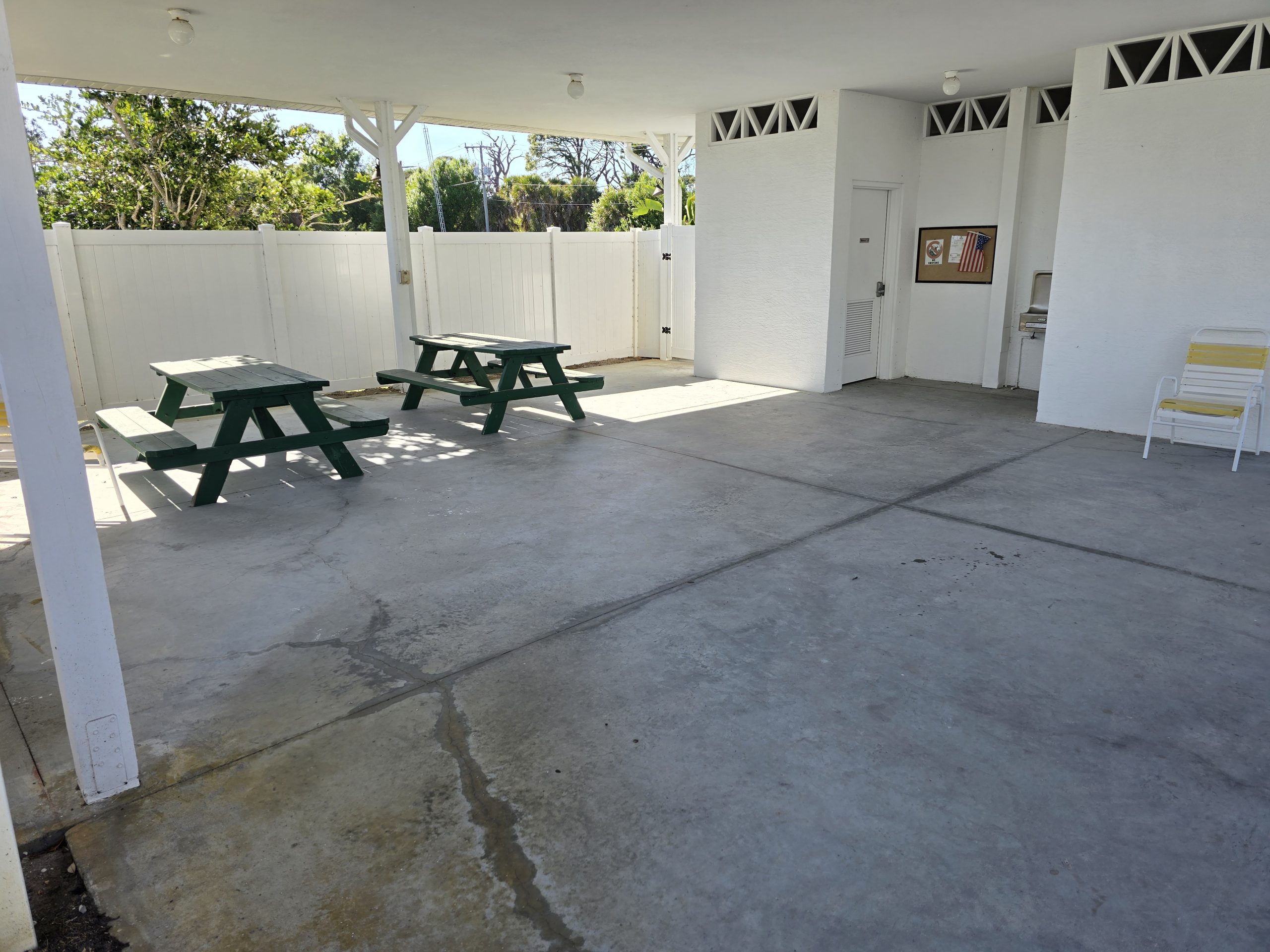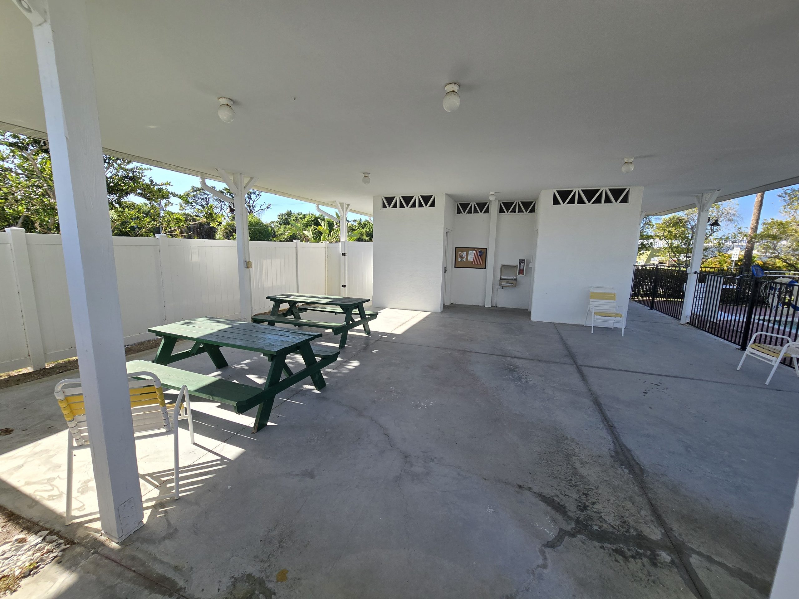 Large concrete workshop space with windows, and covered equipment storage area. Pastures are supported by water hydrants, and the water