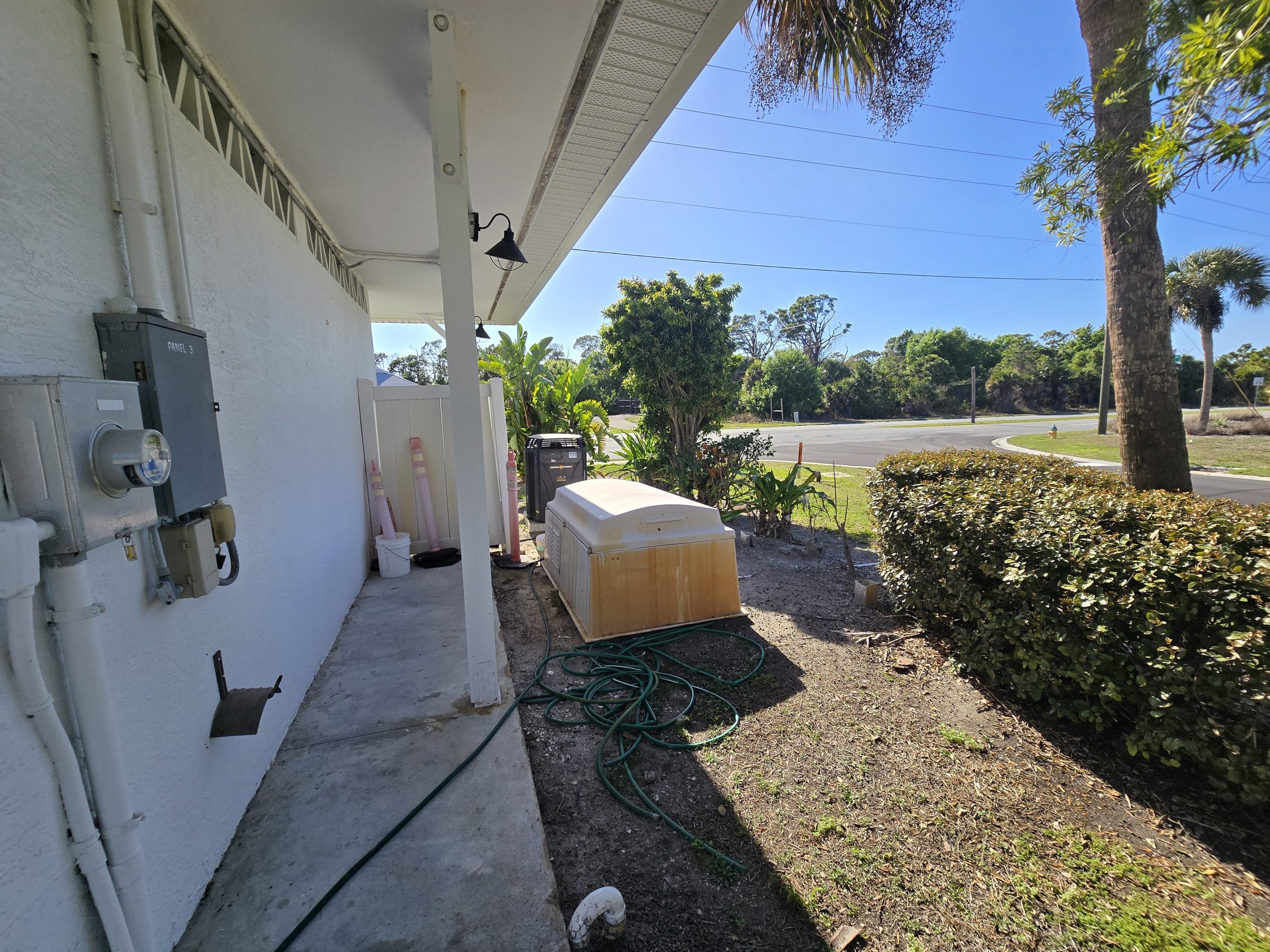 connects via a covered breezeway, and a transfer switch at the main panel allows for a portable generator backup for essential systems if the
