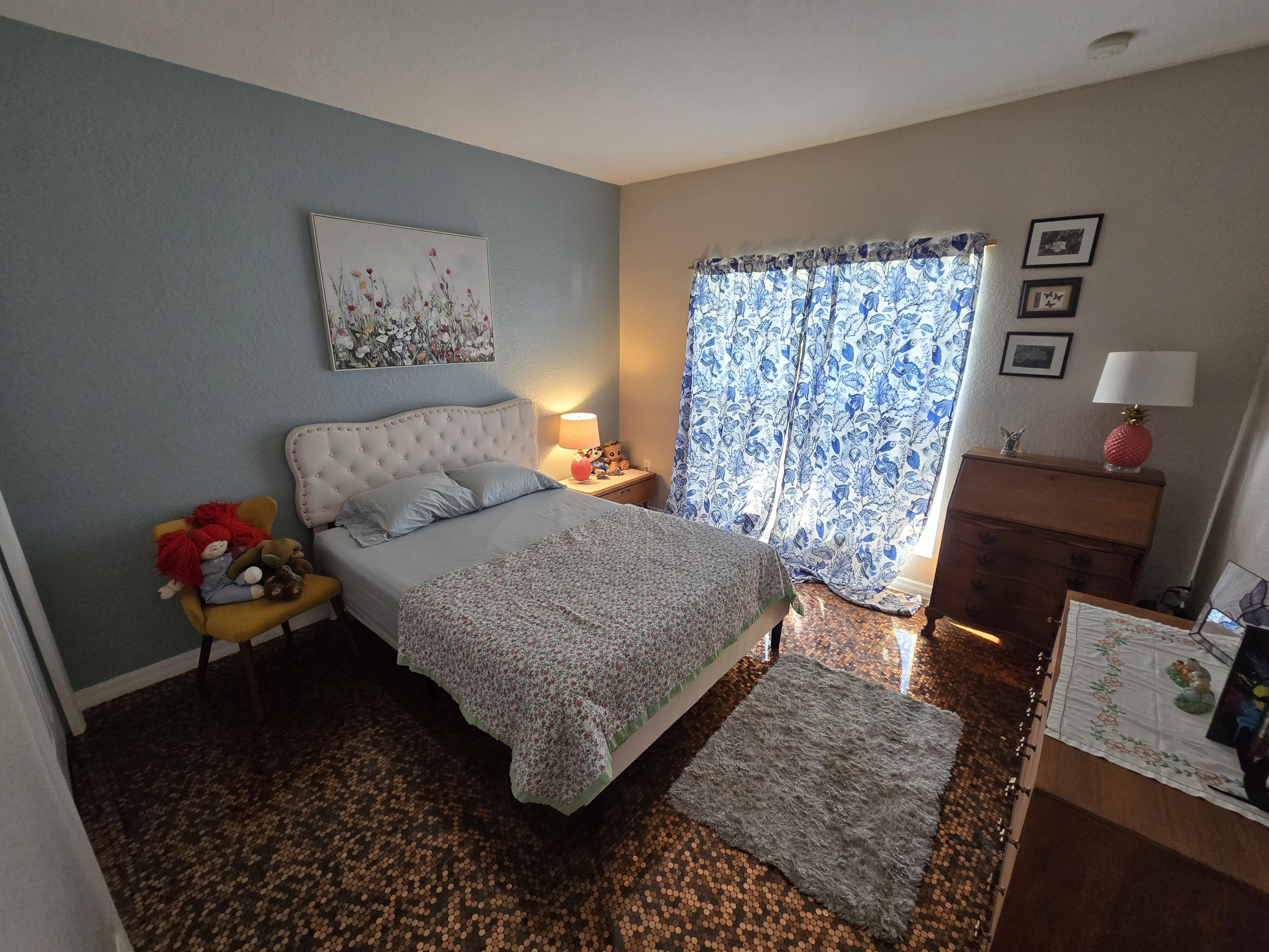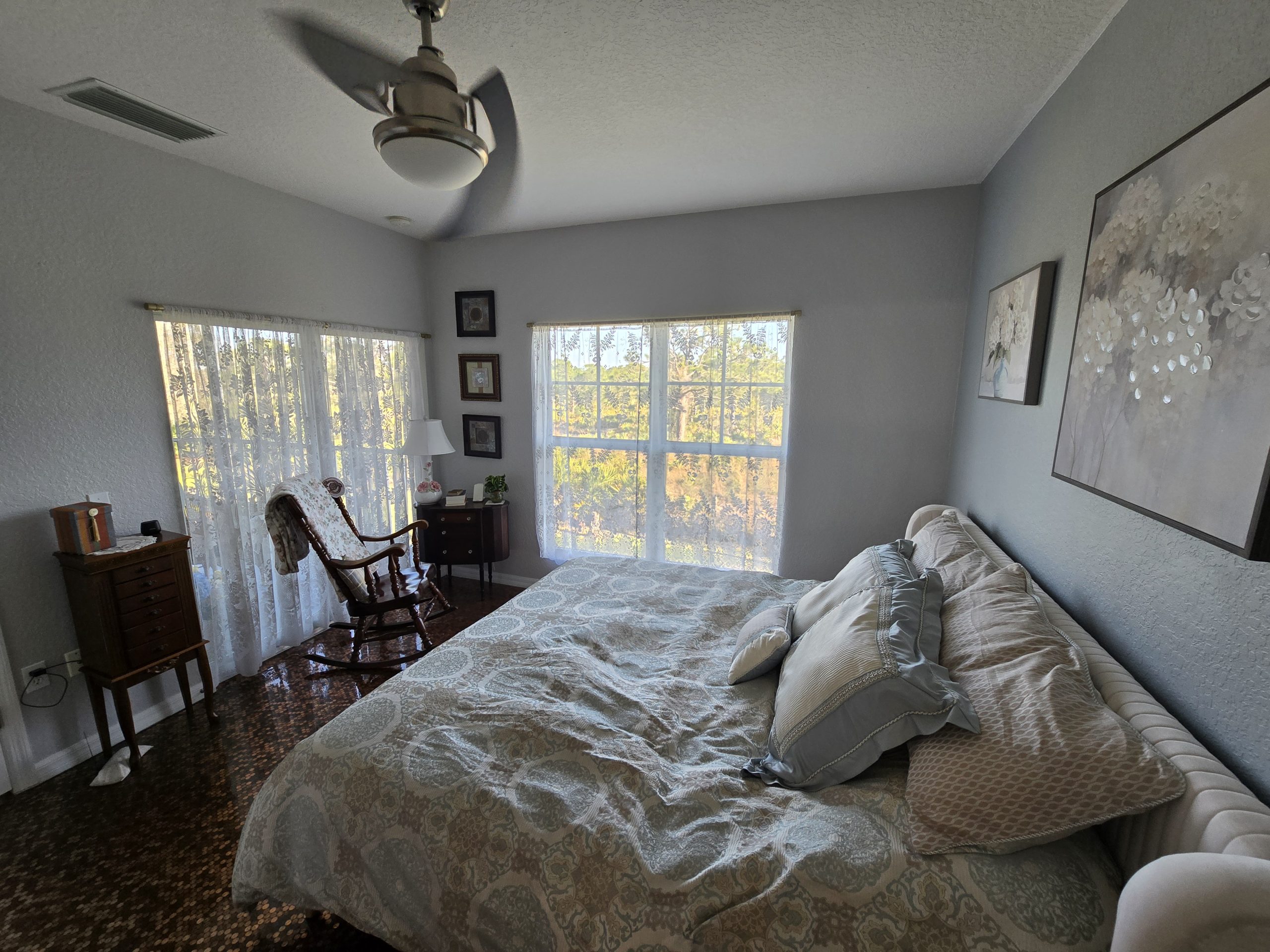 the sliders to enjoy the breezes where you’ll find room to relax, grill or host friends. The patio surface, as well as the driveway have a customized