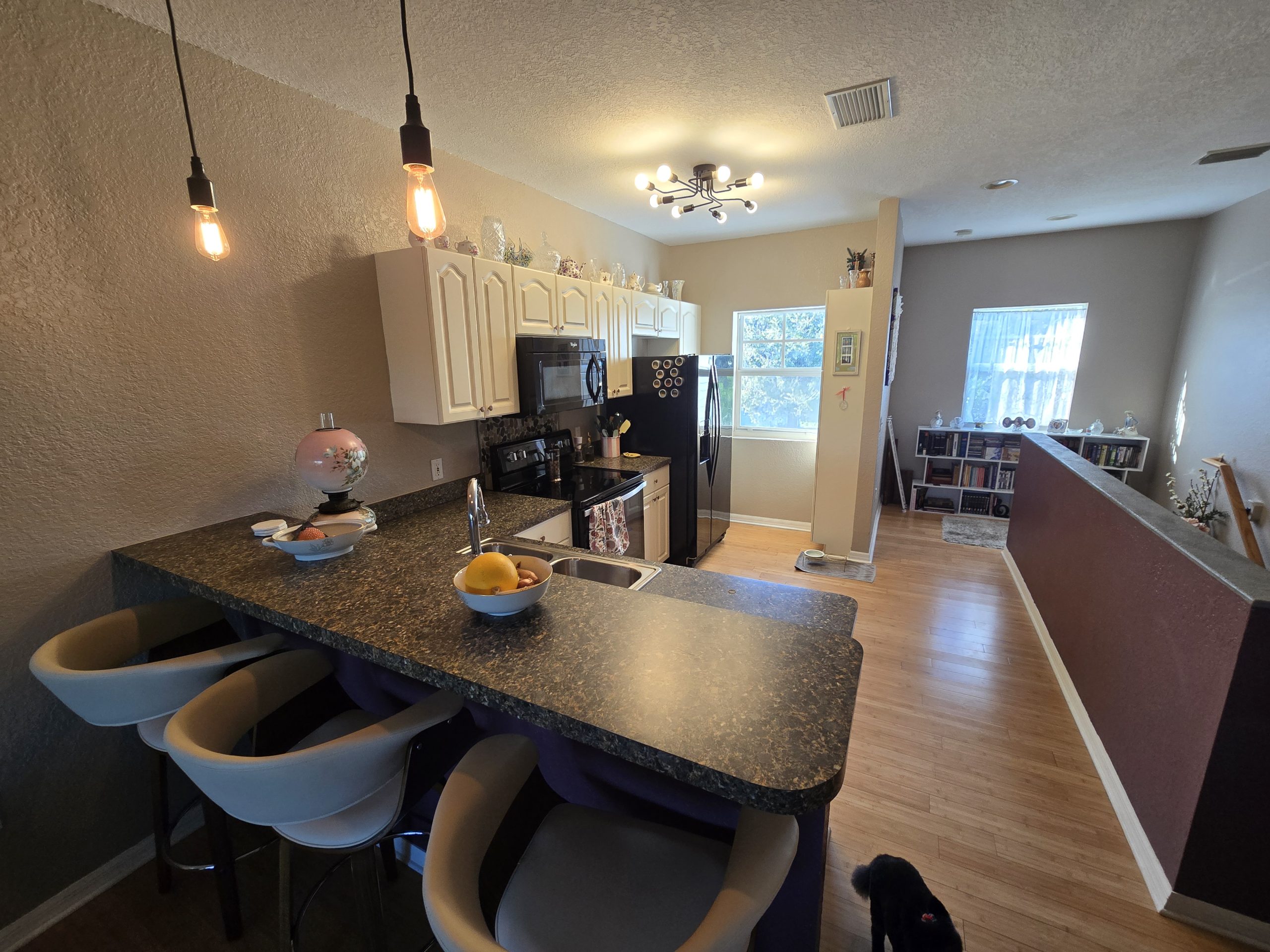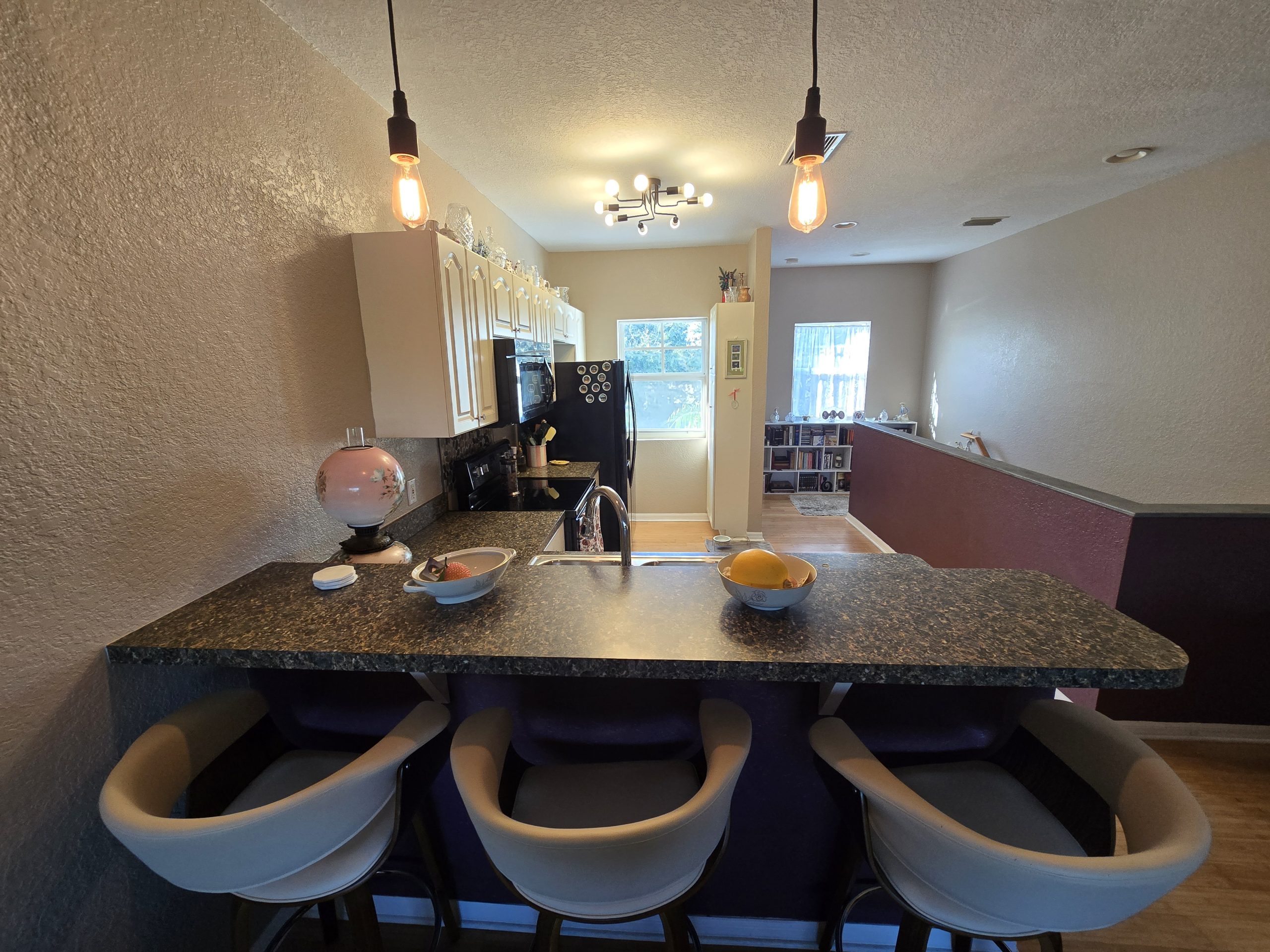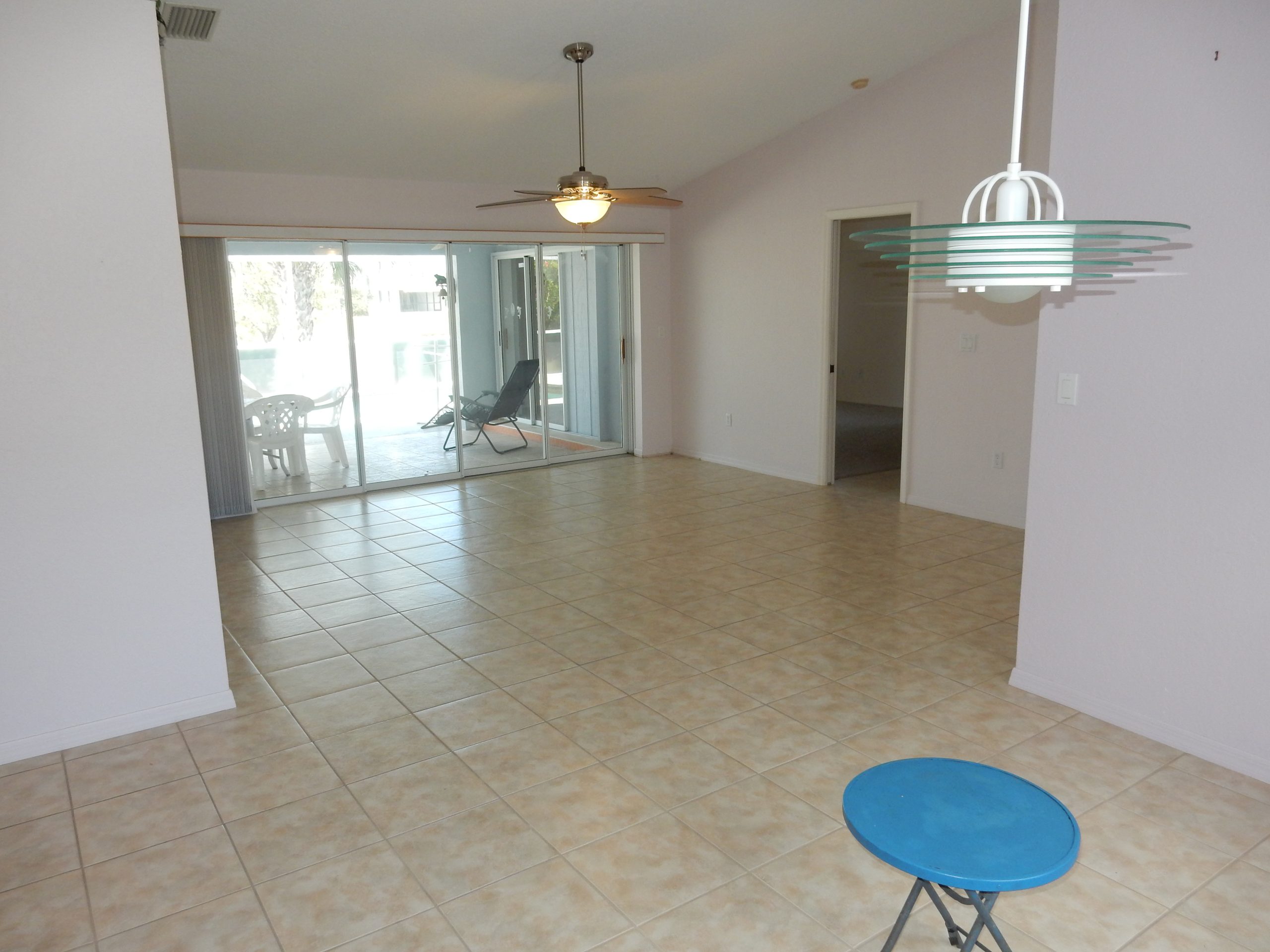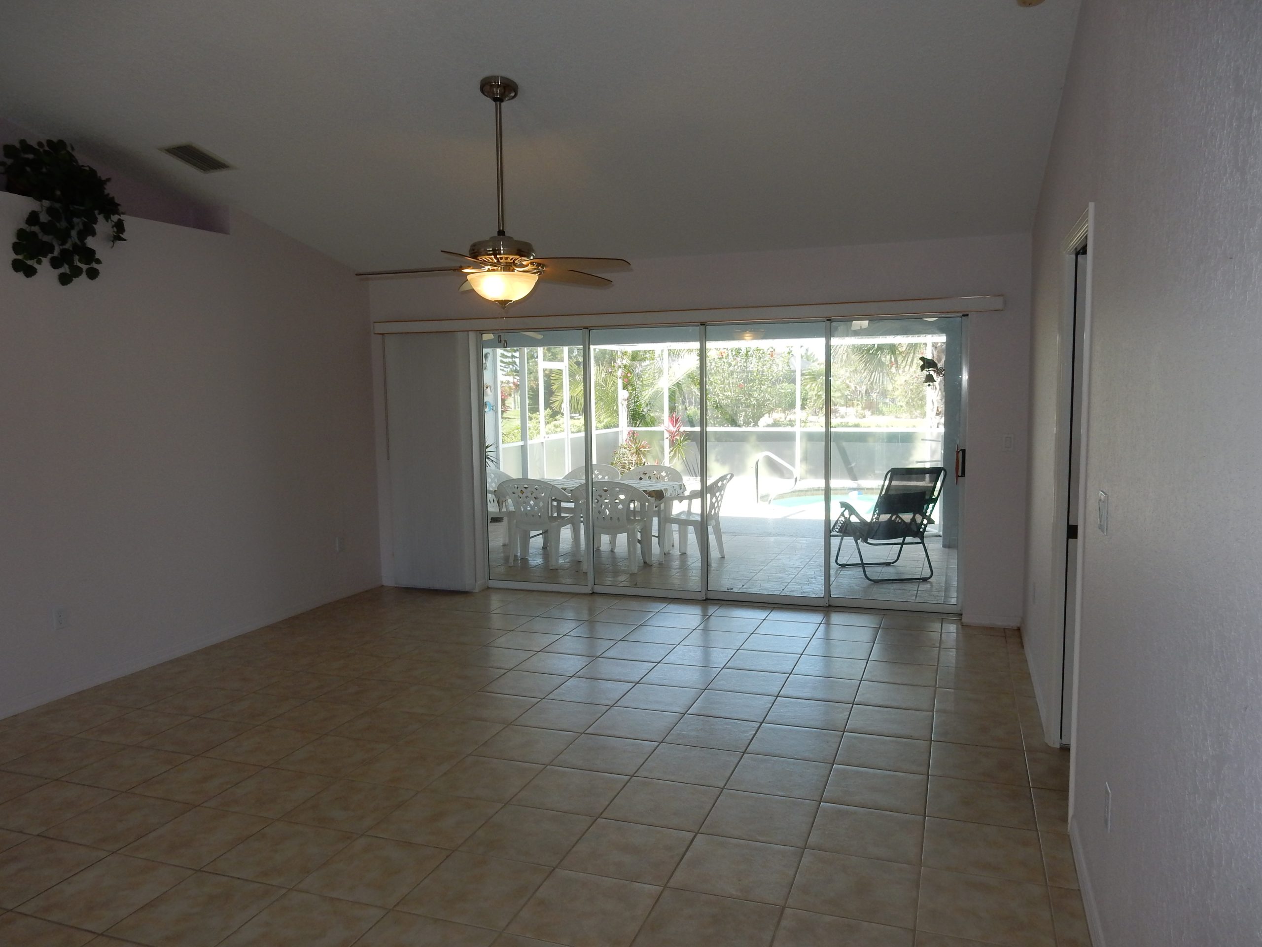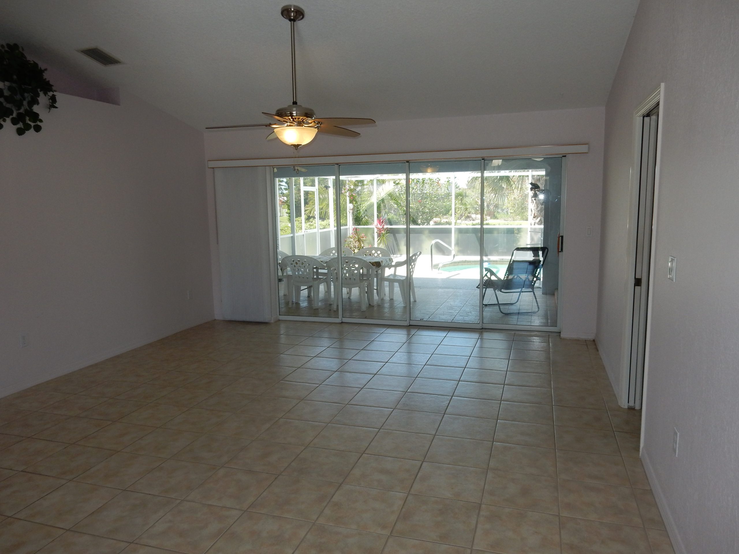 comfortable, with an open living area that overlooks a large screened pool and patio. The kitchen has plenty of storage and connects easily to the