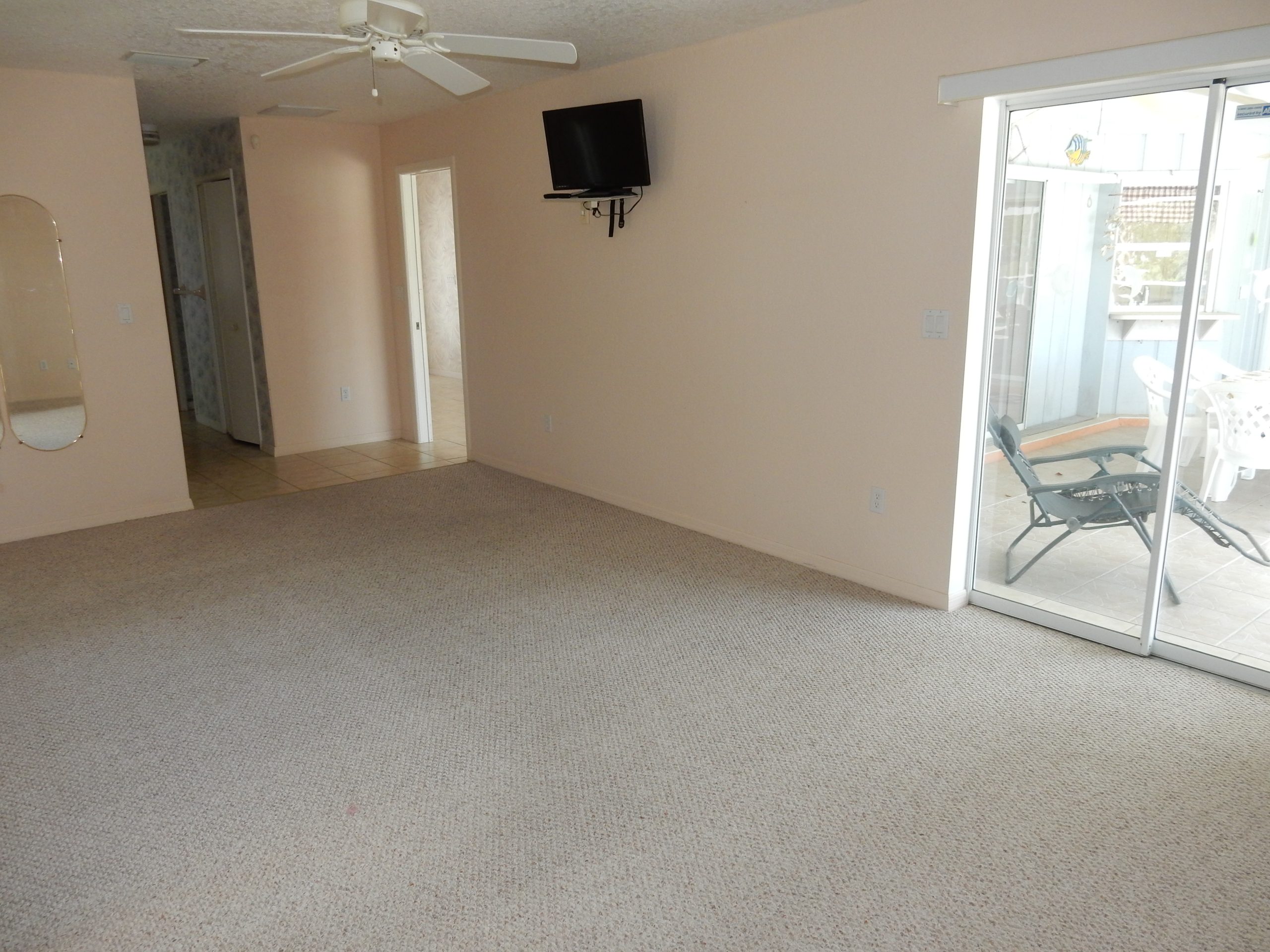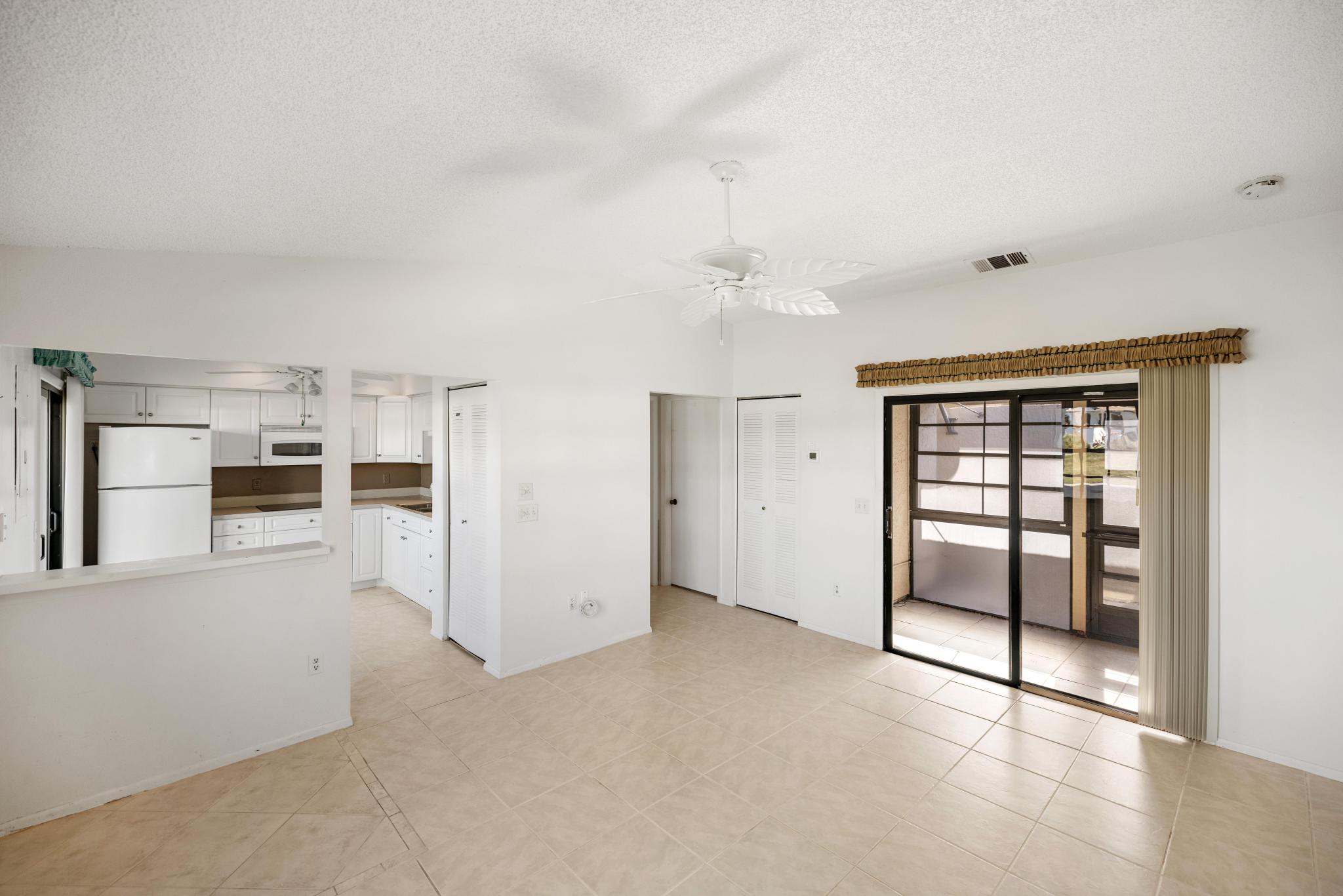 that flows seamlessly to a private screened patio through sliding glass doors. The galley-style kitchen includes a pass-through window, making it