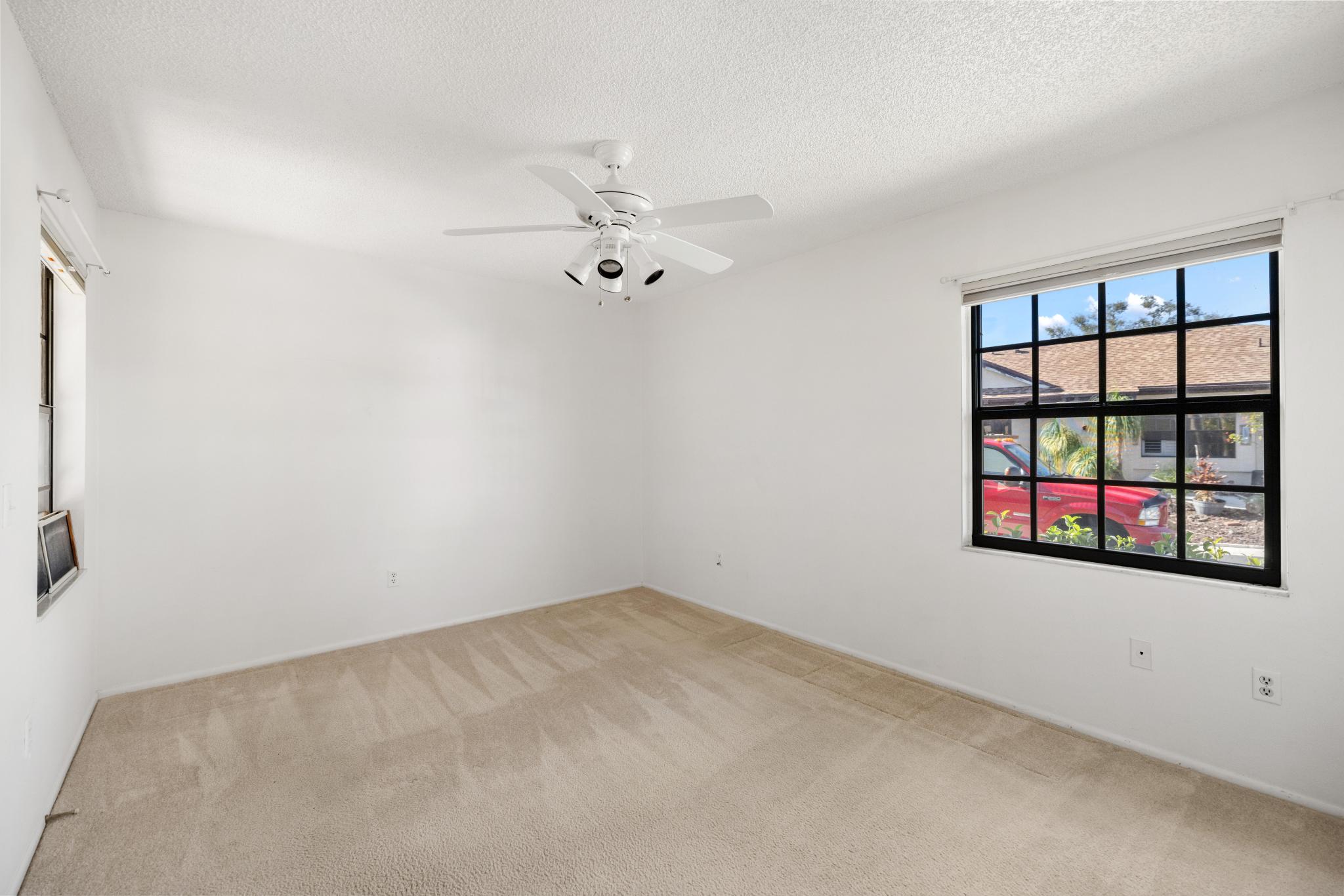 and three outdoor ceiling fans. Major improvements include a “NEW ROOF” installed February 2025 with transferable warranty, New hurricaneimpact windows, a 2022 air conditioning system, and new carpet. Additional features include an irrigation system using community water and a
