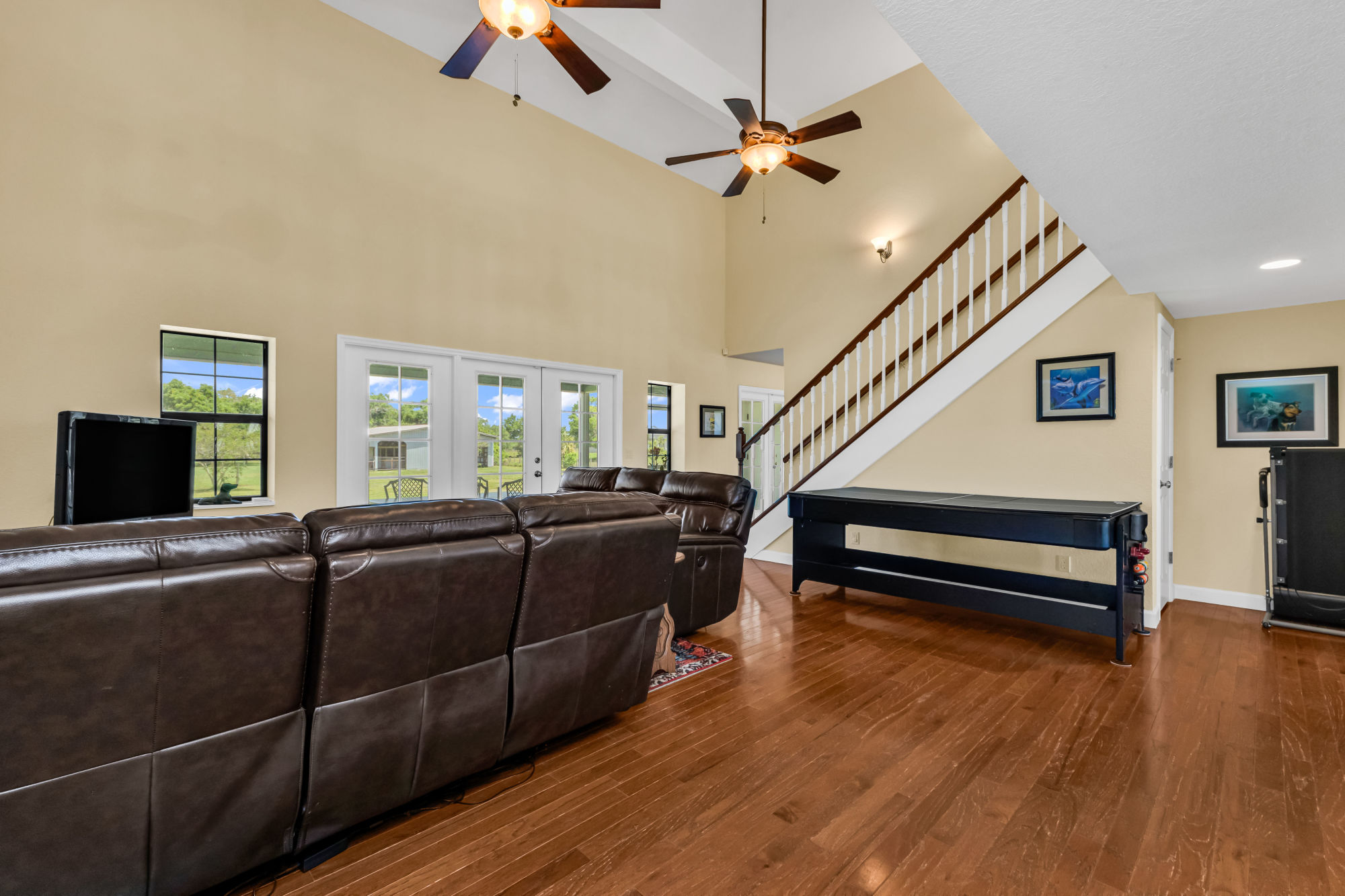 already in place for a potential outdoor kitchen, making this space perfect for entertaining. Enjoy year-round comfort with six indoor ceiling fans