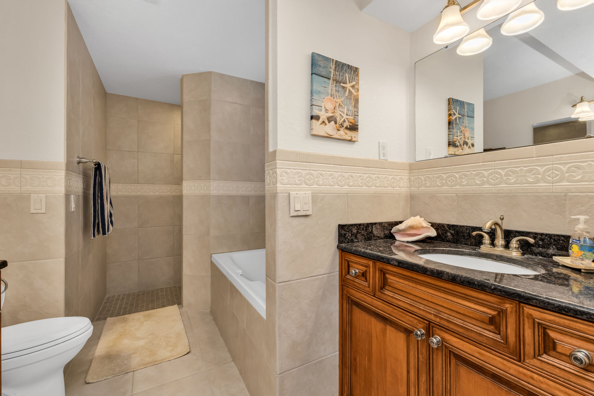 separate granite vanities, a doorless Roman shower, and an Aqua-Glass jetted tub. Upstairs offers two bedrooms, each with dual closets, a full