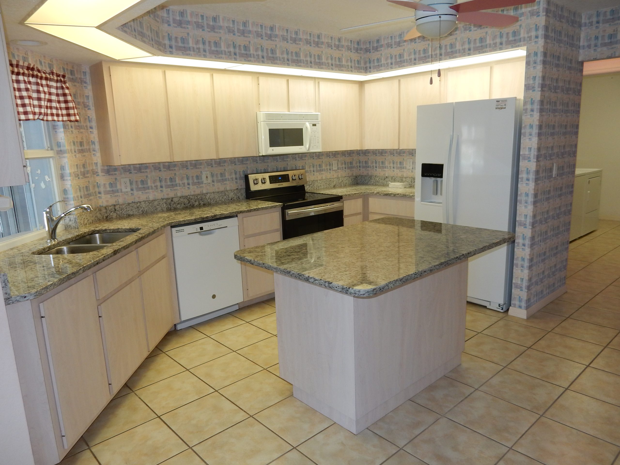 has a convection oven. A window overlooking the countryside. A nearby half bath with a granite-topped wood vanity is ideal for guests or future