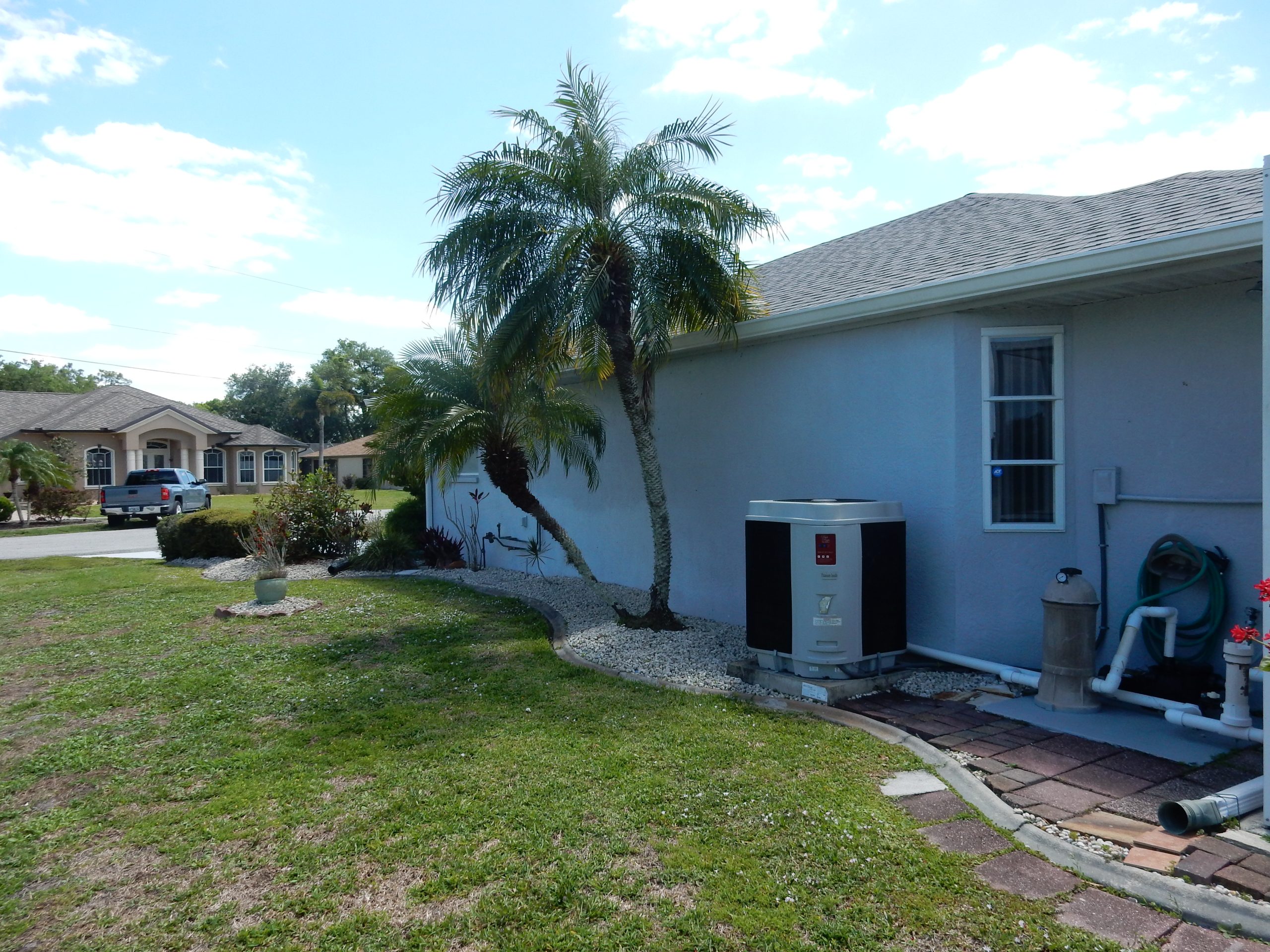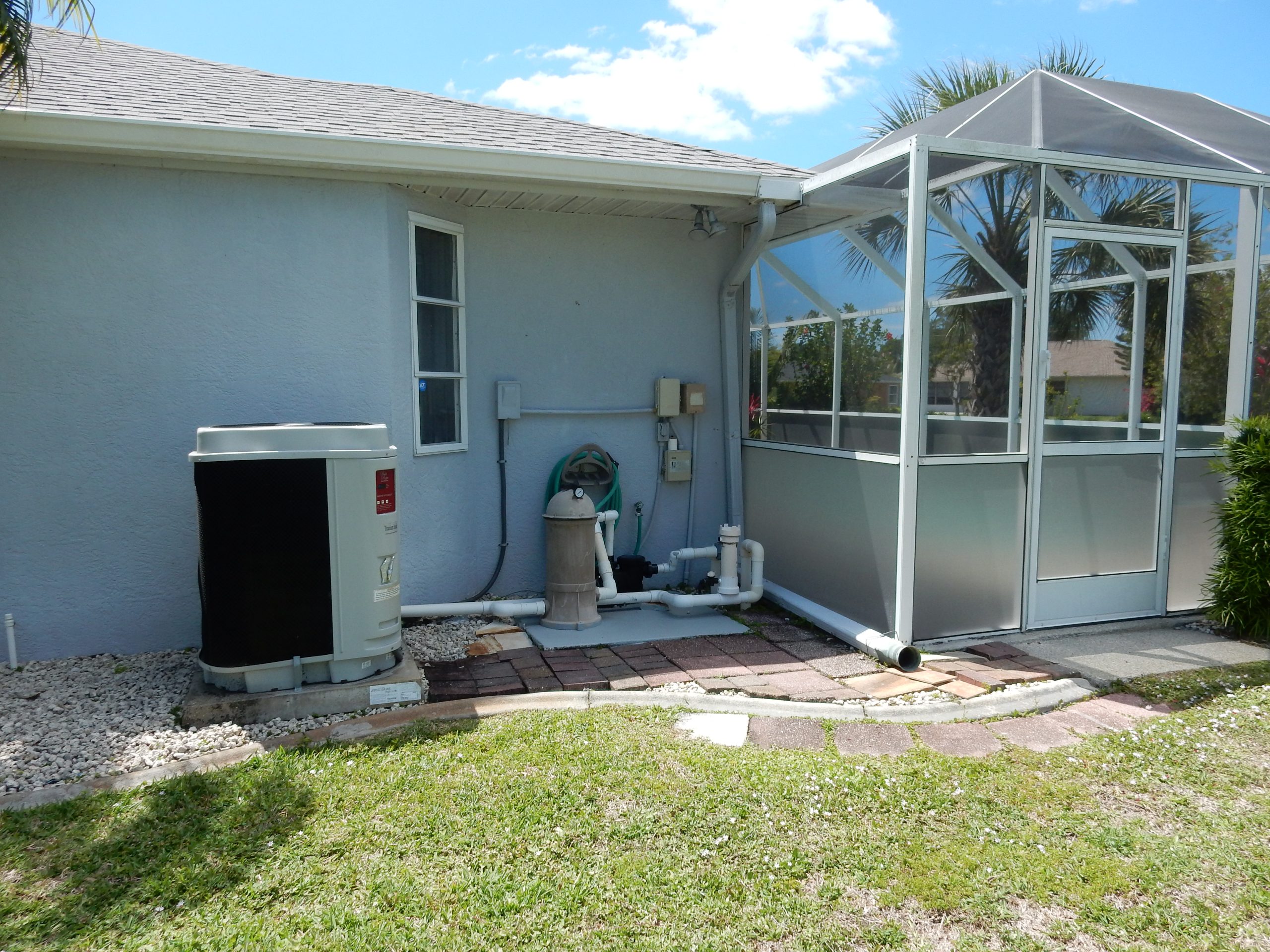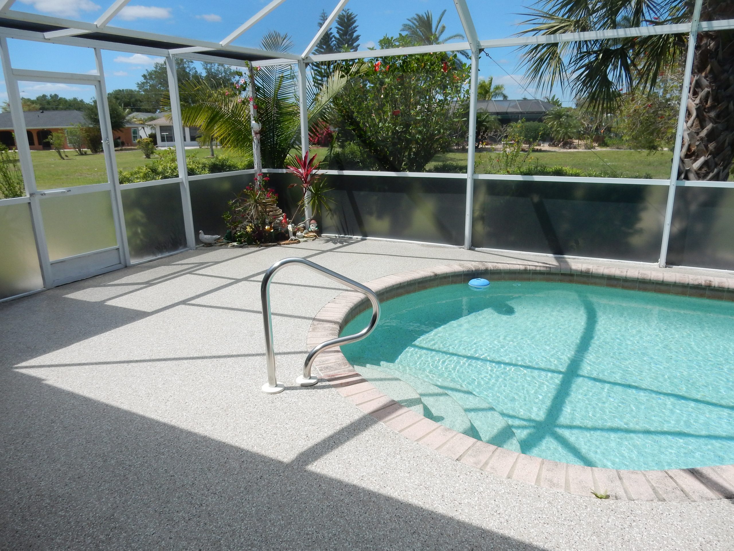 generous wraparound screened lanai overlooking the sparkling pool, complete with a soothing water fountain and child safety gates. Plumbing is